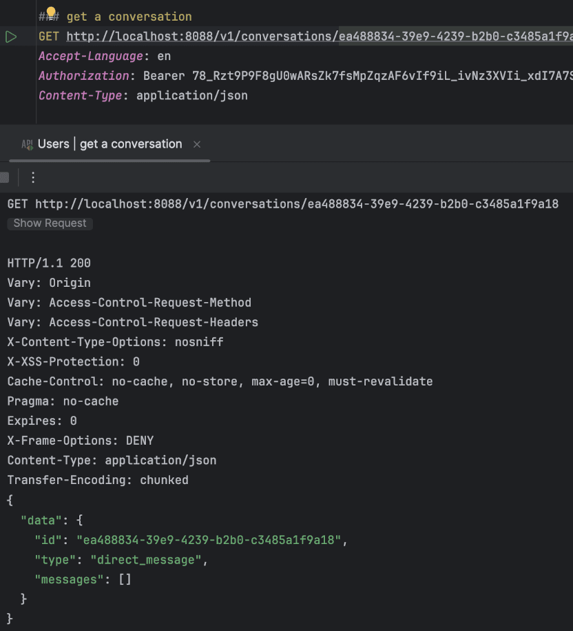 Now, with the correct conversation ID and message ID, we can call the /v1/conversations/{conversationId}/messages/{messageId} endpoint along with the correct Authorization header to retrieve the desired message.